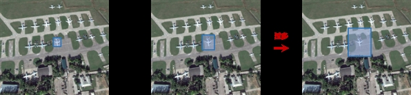 正激励噪声这一现象启发了我们重新审视对噪声的处理方式,这一思路可以用于信号处理、人工智能、涉水光学等多个领域,也是临地安防的重要理论基础之一。譬如,在跨域遥感的目标检测中,传统认知里通常认为背景是需要剔除的“噪声”,圈定目标的外围框就应该越小越好;然而正激励噪声启发我们,在合适的场景下,利用部分背景反而可以实现更为精准的检测:比如我们想在遥感图像中检测出飞机等目标,在这个场景下,飞机都变成了相对较小的目标,而飞机周围经常出现的背景(如跑道、停机坪)则能够在这次场景下帮助提高检测率(见图3)。就是说,不要把圈定飞机的框画得太接近飞机,而是适当大一些,包括进来一些飞机旁边的场景,反而能让飞机识别得更好,因为外围的场景中包含了一些与飞机这个目标有语义关联的内容,例如跑道。不过,仍需要注意的是,过多地引入背景信息显然也会影响检测效果。