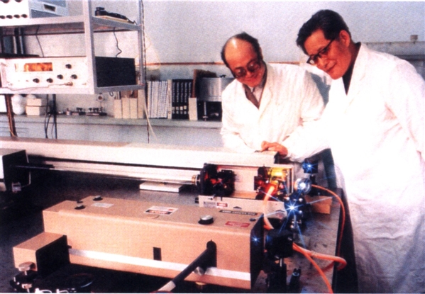 1983年2月,徐叙瑢(右)在长春物理所能谱实验室同戴仁崧检查PS激光系统