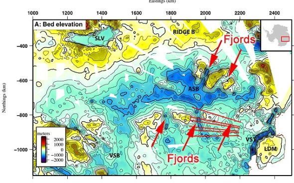 这张南极大陆东部冰盖下的地形图上显示出几处大型的峡湾地貌,这是大约3400万年前至1400万年前这一地区大规模冰川进退留下的遗迹。