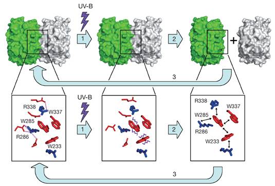 为了解决这个问题,施一公与邓兴旺的研究组合作,获得了UVR8野生型以及两个突变体的高分辨率晶体结构(1.8埃-2.0埃)。这些结构显示,UVR8在紫外线B波段光照之前,是一个由两个相同的单体形成的二聚体,其中每个单体由7个富含b-折叠的WD40结构域组成。两个单体通过众多氢键紧密结合在一起。通过野生型与突变体UVR8结构的比对,以及进一步的基于结构的生化分析,作者阐明了UVR8的感光机理:UVR8单体中,两个色氨酸(W285和W233)组成了感受紫外线B波段的核心基团,当受到紫外线(280-315 nm)照射时,两个色氨酸的吲哚环电子被激发,破坏了W285和W233与相邻的两个精氨酸R286、R338之间的紧密的电荷作用(cation-p interaction),影响了R286、R338在结构中的稳定性,而R286、R338正是参与形成两个UVR8单体间氢键的关键氨基酸,二者受到扰动,破坏了相应氢键,从而使UVR8二聚体解聚。