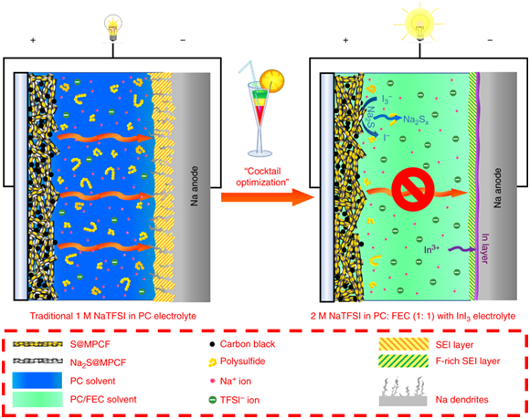 在300–350°C温度下工作的高温钠-硫电池,已经被商业化地应用于大规模的能量储存和转换。然而,这种电池存在的安全隐患极大的阻碍了它的广泛使用。近期在发表于《自然-通讯》上的论文A room-temperature sodium–sulfur battery with high capacity and stable cycling performance中,来自清华大学的Baohua Li,来自西班牙CIC ENERGIGUNE研究所的Michel Armand及来自悉尼科技大学的Guoxiu Wang带领的团队报道了一种具有高电化学性能、高安全性能的室温纳-硫电池。该实验团队采用了“鸡尾酒优化”电解体质系:以碳酸丙烯酯和氟代碳酸乙烯酯为共溶剂,并加入高浓度钠盐,用三碘化铟作为添加剂。作者通过第一性原理计算和实验表征验证,氟代碳酸乙烯酯溶剂和高盐浓度不仅显著降低了多硫化钠的溶解度,而且在循环过程中,会在钠阳极上构建一个稳健的固体电解质界面。与此同时,采用三碘化铟作为氧化还原媒介还增加了阴极上硫化钠的动力学转化,并在阳极上形成钝化铟层,以防止其受到多硫化合物的腐蚀。作者开发的钠-硫电池表现出了高容量和长循环稳定的特性。