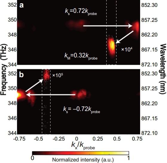 (a)只有kM =0.32kprobe和?f = 2.8 THz调制的超表面(ks = 0.72kprobe)才会发生向下的光子转换。转换后的信号被放大了倍,以便更好地显示。(b)相反,在具有ks = -0.72kprobe的超表面上进行相同的时间相位调制时,只会发生向上的光子转换。转换后的信号被放大了倍,以便更好地显示(放大的区域被白色方框包围)。