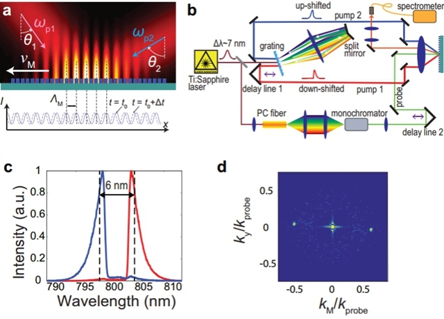 (a)图示两个频率间隔很近分别为和的泵浦光束分别以入射角和撞击超表面。它们在超表面上产生周期为,速度为的干涉条纹。由于移动干涉条纹,超表面上的纳米天线在相移中存在时变性。(b)实验装置示意图。将800nm的钛宝石飞秒脉冲激光器的输出分成两束:一束直接通过传输光栅产生频移泵浦光;另一个被发送到光子晶体光纤(PCF), 以产生波长可调的探测光束。采用两条延迟线实现三束光之间的时间同步。非球面透镜将泵浦和探测光束聚焦到超表面上。反射的信号由D形反射镜接收并由光谱仪检测。通过监测在非球面透镜的傅里叶平面上采集到的光谱,我们绘制了反射信号的频率和动量。(c) 两束泵浦光的光谱显示波长差为6 nm(对应于?f of 2.8 THz)。(d) 二维傅里叶变换的干涉图样两泵束,说明和相同,是波长为860nm的探测光在自由空间中的波矢。