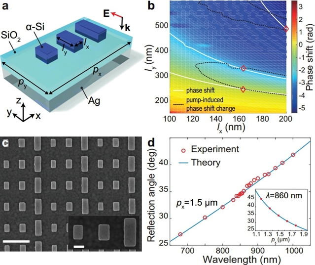 (a)超表面单个单元的3D示意图,由三个非单晶硅纳米棒天线组成。银磨板,二氧化硅间隔层,和非单晶硅厚度分别是200nm,50nm,150nm。(b)计算单个纳米天线不同参数和对应的相移。当泵浦光以15GW/cm2的强度照射时,它被等高线覆盖,显示0.32弧度的泵浦相移变化(黑色虚线)。白线是表示在静态条件下等间距相移的等值线。红色空心棱形标记的三种不同结构的纳米天线以2π/3的间隔覆盖2π静态相移用于组成超表面。(c)加工完成的非单晶硅超表面的FESEM图像。主图和插图的比例尺分别是1μm和200nm。(d)=1.5μm,波长由680nm到1000nm的光正入射到超表面上得到测量(红圈)和计算(蓝线)的异常反射角。插图展示了λ=860nm异常反射角随从1.2μm到1.8μm的变化。实验结果与理论基本一致。