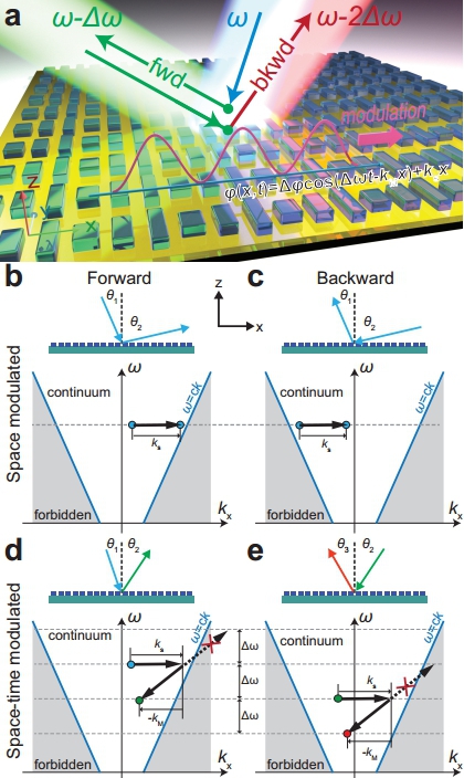 (a)由谐振介质纳米天线组成的时空相位调制超表面反射模式下的示意图。在设计的沿x方向相位梯度上叠加一个正弦移动相位调制。频率为的光打到超表面上由于动态相位调制转化为频率为的反射光,而后向传播的光束频率由变为,产生非互易效果。对比普通空间调制超表面(b)(c)和时空相位调制超表面(d)(e)。普通空间调制超表面仅支持对称对称的正向(b)和反向(c)反射,如图所示。无频率转换。这个过程使互易的,前后两束光的轨迹相同。时空相位调制超表面支持非对称的正向(b)和反向(c)反射。它不仅在沿x方向提供了额外的动量,也转换了效率。无论正向还是反向,向上的跃迁是禁止的,由于产生的波矢过大,在自由空间得不到支持,从而导致能量和动量空间中的单向光子跃迁。因此,光束的运动轨迹不同,表现出非互易效应。为空间相位调制引入的线性动量,为时间相位调制引入的附加线性动量。