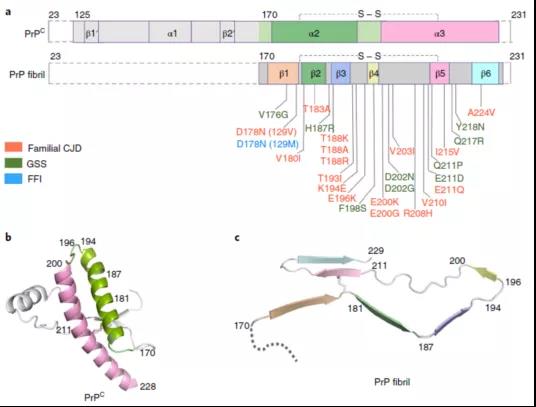 进一步研究发现,PrP纤维核心主要由其C端的170-229组成,包含6个β-折叠结构(从β1到β6)。