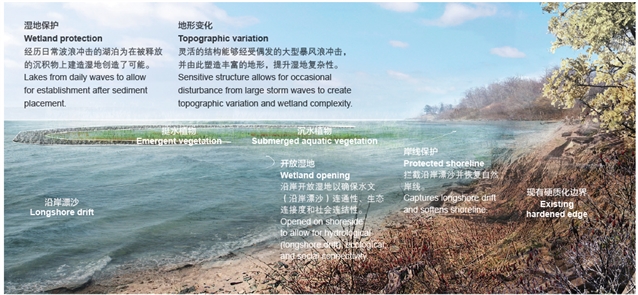 HPF项目团队构思了一个半开放湿地设计方案,在抵挡浪潮冲击的同时兼具渗透性、动态性和连通性等特征。湖边的构筑物将为湿地的营造提供必要的防波保护,也能抵挡偶发的随机干扰事件;波浪和水流被用于创造生态复杂性和保持生物多样性;湖岸的开放结构将提升与近岸地区之间的关键水文连通性和生态连接度;同时,漂流到此的沉积物既可以进入湿地单元,也可流失到环境中,从而实现其在近岸地带的重新分布。