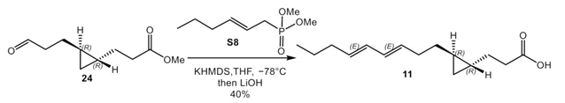 其该项工作从商业可得廉价的(S)-(+)-环氧氯丙烷 (16) 出发通过三步反应快速构建了反式环丙烷结构,再通过还原反应、Wittig反应、臭氧化等反应通过五步实现增碳操作,之后利用HWE反应实现了溴代共轭二烯的快速构建[2],十步的总产率是3%。