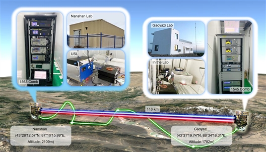 在上述技术突破的基础上,研究团队在新疆乌鲁木齐成功实现了113公里自由空间时频传递,时间传递万秒稳定度达到飞秒量级,频率传递万秒稳定度优于4E-19,系统可容忍最大链路损耗高达89dB,远高于中高轨星地链路损耗的典型预期值(约78dB),充分验证了星地链路高精度光频标比对的可行性。