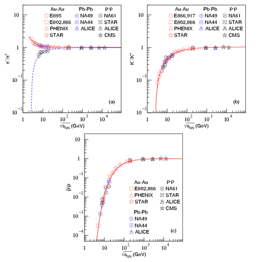图1. 粒子比。其中 (a)、(b)、(c) 分别对应负/正π介子、负/正K介子、反/正质子的比率随碰撞能量的变化。