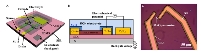 纳米器件,例如细胞内记录传感器、电子设备、太阳能电池、热电转换设备和纳米发电机,有望成为免维护植入式生物传感器的基本组成部分。传统上,集成器件包含三个关键组件:能量收集、能量存储和功能组件(例如传感器、数据发送器和数据控制器)。储能设备可以存储由太阳能电池、纳米发电机或热电转换设备收集的离散能源,然后持续为传感器和电子设备供电。因此,作为集成免维护器件中不可或缺的组成部分,纳米级储能器件的发展具有重要意义。场效应广泛用于纳米级电子器件,例如用于逻辑电路和放大器的晶体管,电子相变和液/固界面的调制,以实现液门控界面超导电性。尽管将磁场与电化学储能器件结合使用已显示出一些有趣的效果,但它需要在器件中加入磁性成分,因此限制了其应用。目前,电场效应尚未集成到电化学储能器件中。尽管电化学储能装置在发生电荷转移时会改变电子特性,但电子态密度(EDOS)的调制与储能过程的直接联系尚不清楚。