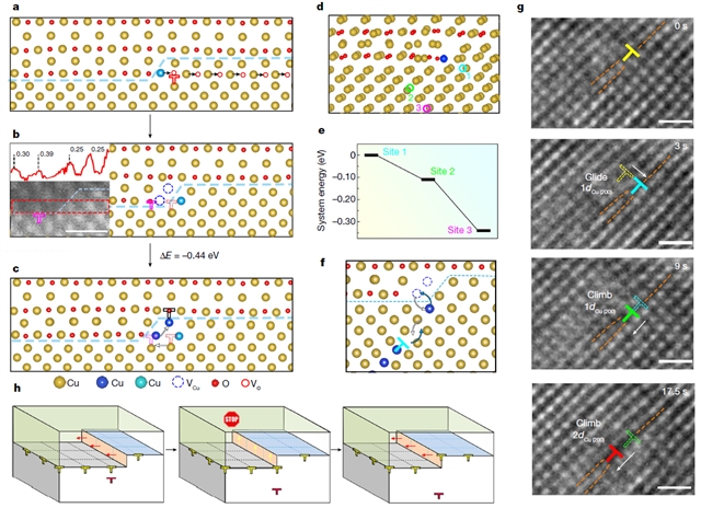 在界面原子台阶前晶格O的次去缺失后,相邻的Cu原子自发地向O空位位置进行横向弛豫,导致它们与底层的Cu晶格完美匹配。Cu原子向O空位位置的横向弛豫导致界面原子台阶前出现Cu空位团。Cu空位团的形成是由于Cu2O侧与Cu侧相匹配的Cu原子数量较少。正是这些结构弛豫产生的Cu空位团使界面原子台阶流动钉扎在界面位错核位置。只有当铜空位团被额外的铜原子完全填充后,界面原子台阶才会恢复流动,相变继续发生。因此,界面位错线整体向上攀移到新的Cu2O/Cu界面是界面原子台阶恢复相变的必要条件。