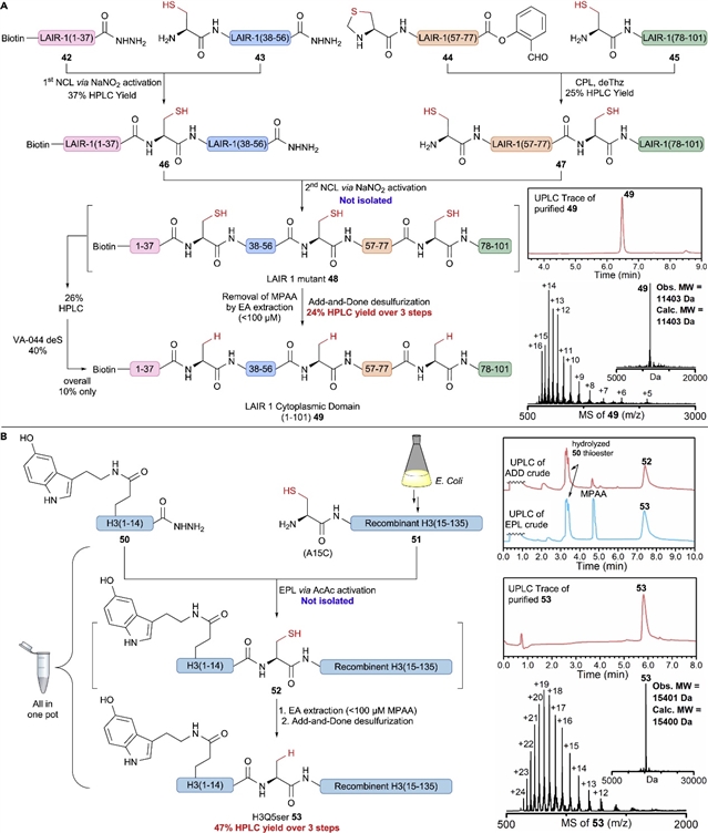 ADD甚至能够克服一定浓度的自由基淬灭剂进行脱硫,可很方便地与现有的自然化学连接反应(Native chemical ligation, NCL)进行联用,从而实现了白细胞相关免疫球蛋白样受体-1(LAIR-1)膜内部分的化学全合成和定点血清素化修饰的组蛋白H3(H3Q5ser)的化学半合成。