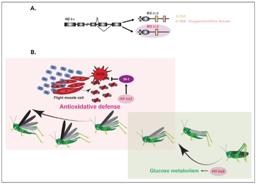 “与其他昆虫不一样,飞蝗特别能飞,一次能飞上百公里。飞蝗在长距离飞行时,会产生大量的有害物。而Hif-1α2受氧的激活来调节DJ-1的表达,从而避免有害代谢物的积累,使飞蝗能够适应长时间的有氧代谢过程。”论文通讯作者康乐说。