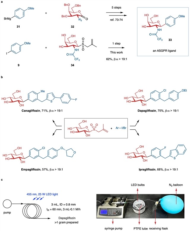为了证明此方法的合成应用潜力,研究人员利用该方法合成了ASGPR抑制剂和一些药物衍生物。此外,该方法被成功应用于四种格列类药物(图3)。研究人员利用流动化学技术合成了大于克级规模的达格列净,展示了规模生产的潜力。