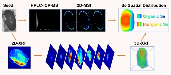 近日,中国科学院高能物理研究所与东北大学等合作,以硒超富集植物-堇叶碎米荠(Cardamine violifolia)单粒种子为研究对象,借助北京同步辐射装置X射线荧光微分析实验站硬件和软件功能升级契机,发展了基于同步辐射X射线荧光二维/三维成像技术、同步辐射X射线吸收谱技术、二维质谱成像技术及微区计算机断层扫描(micro-CT)技术的空间金属组学(spatial metallomics)研究框架,实现了堇叶碎米荠单粒种子中有机硒和无机硒的原位二维/三维成像(图1),首次发现堇叶碎米荠种皮中存在甲基硒代化合物,加深了对堇叶碎米荠富硒机制的认知。