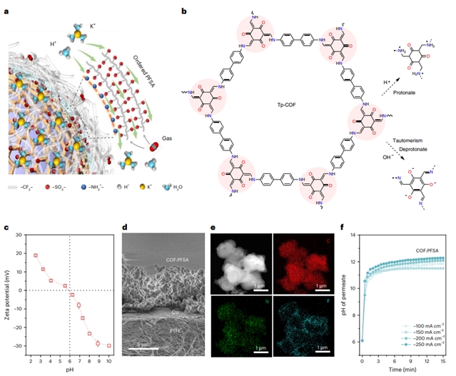 该成果报道了一种可以实现酸性条件下二氧化碳高效转化的催化剂局域微环境调控策略。该策略将一种由共价有机框架(COF)纳米颗粒与阳离子交换聚合物(PFSA)组成的调控层涂覆在催化剂层表面,在强酸电解质条件下降低面向催化剂迁移的质子流、富集碱金属阳离子,从而抑制电解过程中的析氢副反应,实现在二氧化碳向多碳产物的高效转化。