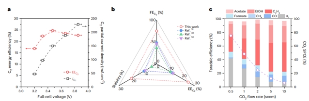 图4:微孔道流动池中酸性二氧化碳电还原实现多碳化学品高效合成。