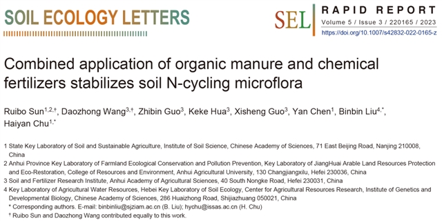 论文标题:Combined application of organic manure and chemical fertilizers stabilizes soil N-cycling microflora(有机肥和化肥配施利于砂姜黑土氮循环微生物群落的稳定)