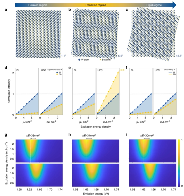 图2. WSe2双层中受转角调制的UPC和PL。(a-c)不同转角下的WSe2双层超晶格示意图,晶格弛豫带来的应变在过渡区转角达到最高;(d-f)不同转角下依赖于激发能量密度的PL和UPC强度图;(g-i)转角双层和相应单层的激发能量密度依赖UPC光谱。