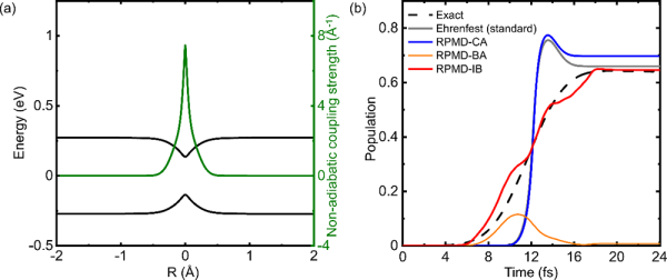 图2. 新发展的RPMD-IB方法在二能级模型中的结果。(a)二能级模型中的势能面(黑线)与非绝热耦合量(绿线)。(b)在不同方法中,电子在高能级的占据数随时间的变化。虚线为量子力学严格解。