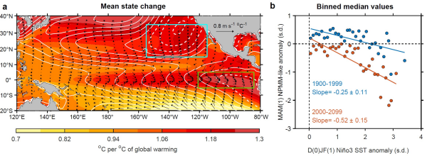 图2. (a)全球变暖后太平洋背景平均态的海温、风场及海表面气压的变化;(b)全球变暖后,次年春季北太平洋经向模态对于前一年冬季热带东太平洋厄尔尼诺暖海温异常的响应增强。