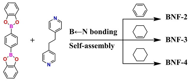 图1:硼酸酯单体BACT和吡啶单体PDE自组装形成开孔(BNF-2)和密闭(BNF-3和BNF-4)的B←N框架。