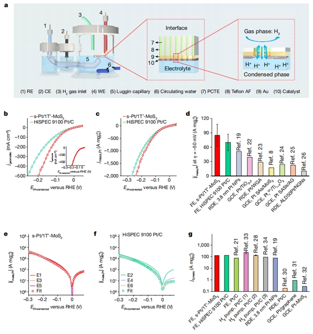 在该工作中,针对上述挑战,张华教授研究团队进一步开发了制备非常规相二维TMD纳米片的新方法,并深入研究了非常规1T′-TMD和常规2H-TMD纳米片上贵金属的晶相依赖生长,发现2H相模板有助于铂(Pt)纳米颗粒的外延生长,而使用1T′相作为模板则能够使铂维持单原子级分散(s-Pt),由此研发出s-Pt/1T′-MoS2材料(single-atomically dispersed Pt atoms/1T′ phase molybdenum disulfide,单原子级分散的铂/1T相二硫化钼)。进一步研究表明,该材料是一种卓越的电催化产氢催化剂。为了克服铂基催化剂在酸性介质中进行电催化产氢反应的质量传输限制(mass transport limitation),研究团队使用了先进的悬浮电极(floating electrode)技术进行测试。研究发现,s-Pt/1T′-MoS2催化剂在-50 mV过电位下能够表现出超高(85±23 A mgPt-1)的质量活性与交换电流密度(127 A mgPt-1)。同时,该催化剂能够在质子交换膜水电解槽中稳定工作五百个小时,极具应用前景。