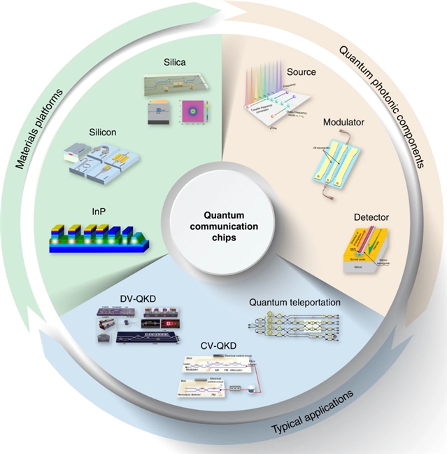 集成量子通信的三个方面:用于大规模集成的光子材料平台;量子光子元件,如量子光源、高速调制器和高效光电探测器;以及在 QKD和量子隐形传态中的典型应用。
