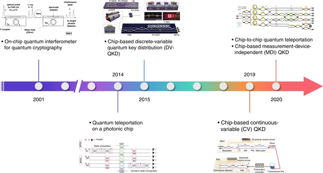 用于量子通信的光量子芯片的进展时间表。关键里程碑包括首次演示用于量子加密的片上量子干涉仪、光子芯片上的量子隐形传态、基于芯片的 DV-QKD、CV-QKD和 MDI-QKD 和芯片到芯片的量子隐形传态。