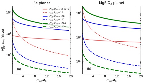 图1:部分潮汐瓦解的情况下,最内轨道中碎片的轨道周期(实线)及其角动量的演化时标(虚线)随行星质量变化的曲线。子图(a)为Fe行星,子图(b)为MgSiO3行星。红线、蓝线和绿线分别对应行星轨道周期为10天、100天和1000天的情况。