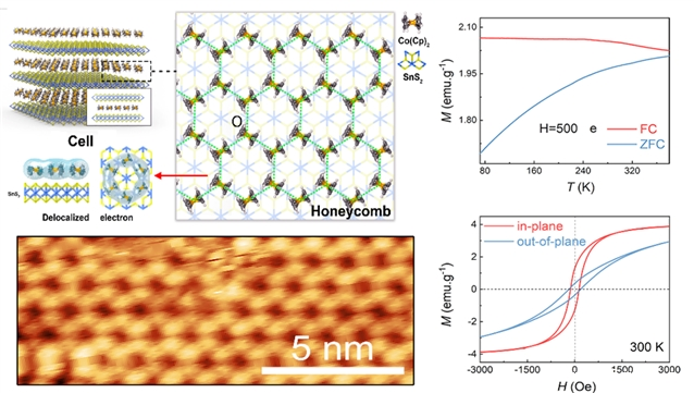 磁性分子作为一种磁性基元,其较远距离的交换相互作用带来了不依赖特定无机晶体结构新型铁磁有序体系,成为了解决上述挑战的切入点。然而,如何操控分子间相互作用实现长程自旋有序仍然是一个挑战。为了解决这一挑战,该团队利用二硫化锡(SnS2)层状材料层间,以有机分子(二茂钴(Co(Cp)2)作为磁性基元,通过插层化学,基于层间限域效应构建了类蜂巢状的室温磁性分子单层结构。