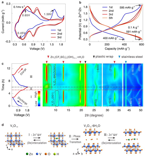 图 1. V6O13正极材料的电化学诱导相变: (a) CV曲线; (b) 电池充放电曲线; (c) 正极材料原位 XRD图谱; (d) 电化学诱导相变反应机理图 (仅显示主要组分 )和 Zn2+/H+储存机理。