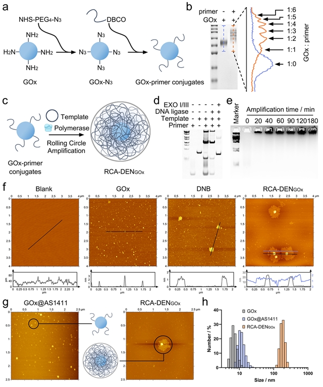 RCA-DEN可以被轻松制备、结构均一且酶和核酸活性均不受影响:通过形态表征和粒径表征可以证明RCA-DEN可被成功制备且粒径均一(图1),且制备过程对酶和核酸的活性未产生影响(图2)。高度结构化的DNA纳米层由多价AS1411/Hemin构成,不仅为酶提供了强有力的稳定保护,还保留了AS1411/Hemin的类过氧化物酶催化活性。
