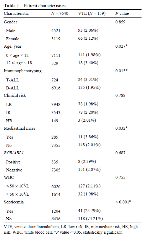 华中科技大学同济医学院附属同济医院胡群和上海儿童医学中心沈树红等等针对中国儿童急性淋巴细胞白血病患者中静脉血栓栓塞症的流行病学、临床特征及危险因素进行了分析,并探讨了静脉血栓栓塞症发生的风险因素。研究收集了2015年1月至2019年12月间20家医院诊断的7640名急性淋巴细胞白血病患者的静脉血栓栓塞症数据。根据形态学结合免疫学、细胞遗传学和分子生物学标准为患者诊断,并进行统计分析。