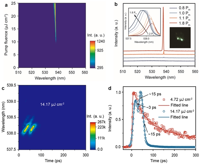 图2.钙钛矿多量子阱纳米线单模激光发射及其双脉冲特性。a-b.纳米线单模激光随泵浦密度的演化;c-d.泵浦密度为14.17 μJ cm-2时的时间分辨光谱,表明二维纳米线单模激光具有两个激光脉冲特性。