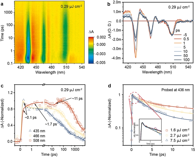 图3.瞬态吸收光谱揭示双脉冲产生过程的载流子迁移和复合动力学。a.泵浦密度为0.29μJ cm-2时,400 nm激光脉冲激发后,在50 fs到7600 ps间的瞬态吸收光谱;b.泵浦密度为0.29μJ cm-2时选定某些时间尺度的瞬态吸收动力学曲线;c. 在435 nm、466 nm和508 nm波长下的瞬态吸收动力学曲线;d.不同泵浦密度下n=2量子阱的瞬态吸收动力学曲线。