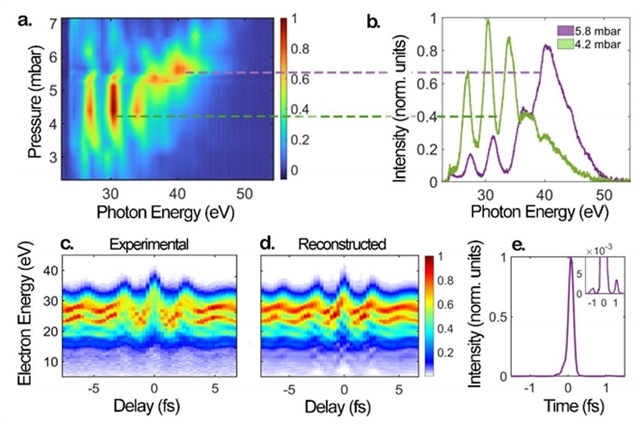 图 2:(a) 展示了随着气体压力变化,XUV脉冲光谱的演变。(b) 展示了两个特定压力值下的光谱,分别是4.2 mbar (绿色曲线) 和5.8 mbar (紫色曲线) 。(c) 展示了在5.8 mbar压力下,使用频率分辨光学门控 (FROG CRAB) 或称为streaking技术测量得到的实验streaking trace。(d) 展示了使用扩展的衍射迭代引擎 (ePIE) 算法重建的streaking光谱图。(e) 展示了重建的XUV强度轮廓,显示了一个干净的IAP,持续时间为180阿秒。插图显示了<1%的IAP卫星结构。