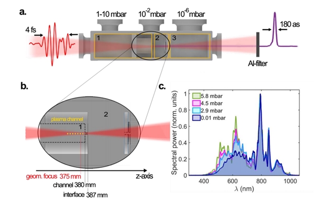 为了克服这些挑战,团队提出了一种基于时间门控相位匹配的新方法,该方法利用了半无限气体池的扩展介质特性(见图1a),以实现有效的IAP产生。研究者们开发了一种先进的模拟技术,结合了非线性传播和宏观高阶谐波产生的三维时间依赖性薛定谔方程,来模拟和优化产生过程。这种方法不仅提供了对实验现象的深入理解,而且通过实验验证了其在实际应用中的有效性,为阿秒科学技术的发展和应用开辟了新的可能性。