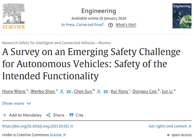 引用信息:Hong Wang, Wenbo Shao, Chen Sun, Kai Yang, Dongpu Cao, Jun Li, A Survey on an Emerging Safety Challenge for Autonomous Vehicles: Safety of the Intended Functionality, Engineering 2024.
