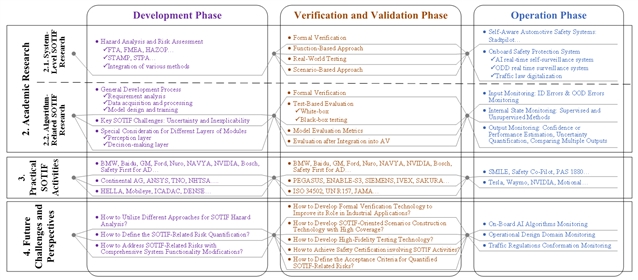 该研究着眼于AI方法,特别是基于学习的算法,同时也提供了对传统算法的见解。在开发阶段,包括需求分析、数据获取与处理、模型设计与训练等子阶段,每个阶段都面临独特的挑战,可能导致功能不足问题。特别是,模型和数据的不确定性是开发自动驾驶算法时的主要挑战,这直接导致SOTIF相关的关键问题。