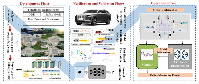在运行阶段,作者强调采用先进技术对模型的输入、内部状态和输出进行实时监测,是确保系统安全与可靠性的关键。通过识别数据和模型状态中的异常,系统能够有效地预测和缓解由潜在性能衰退导致的风险,对抗分布偏移和对抗性攻击,进一步推动自动驾驶技术的发展与应用。
