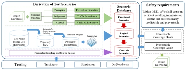 在验证确认(V&V)阶段,作者强调了生成证据以证明组件满足其功能需求,以及自动驾驶汽车的残余风险是可接受的。文中讨论了多种V&V方法,包括形式化验证、证伪和测试,作者强调了基于场景的测试方法在评估系统安全性方面的重要作用以及近年来学术界取得的进展,并说明采用多支柱法以充分利用不同方法优势的必要性。