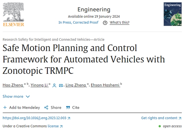 有鉴于此,重庆大学智能汽车团队郑浩、李以农、郑玲与阿尔伯塔大学Ehsan Hashemi在Engineering期刊联合发表了题为“Safe Motion Planning and Control Framework for Automated Vehicles with Zonotopic TRMPC”的研究,采用集合论、管基鲁棒理论与可达性分析等方法,提出了一种保证安全的运动规划控制框架,以增强多维不确定性下的自动驾驶预期功能安全。
