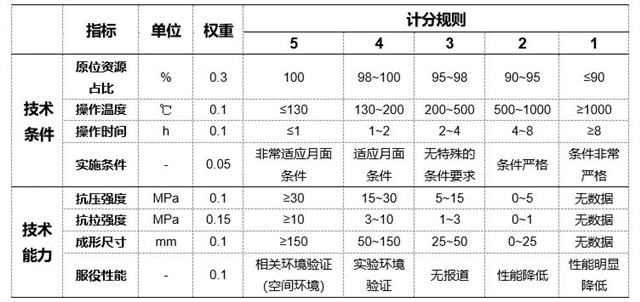 根据评估结果,约束成形技术是评分最高的技术方案,得到3.80分,在操作温度、时间、成形尺寸方面得到满分,原位资源占比99%,抗拉强度2 MPa,仅抗压强度指标低于中性分数,为2~3 MPa。