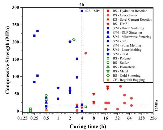3.4 金属粘结:使用铝作为粘结剂,具体方法是将月壤与AlSi10Mg粉末1:1混合,再使用激光加热固化。与激光熔融技术相比,铝粘结剂降低了固化产物的脆性,其抗压强度最高达到264 MPa。