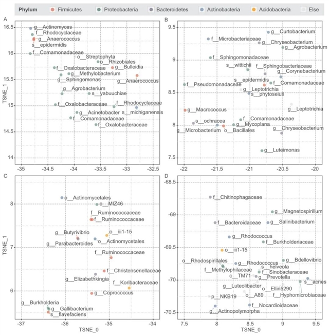 图2 OTU按功能聚集的示例:(A)该区域微生物普遍来自土壤和叶际,常常在鲜切蔬菜中被检测到。(B)该区域的微生物往往源自乳制品、鱼类和肉类等蛋白质来源食物。(C)该区域的微生物通常与纤维素和糖的消化吸收有关。(D)该区域的微生物主要与污染物的降解有关,常被用于塑料、石油、抗生素污染等的生物修复中。