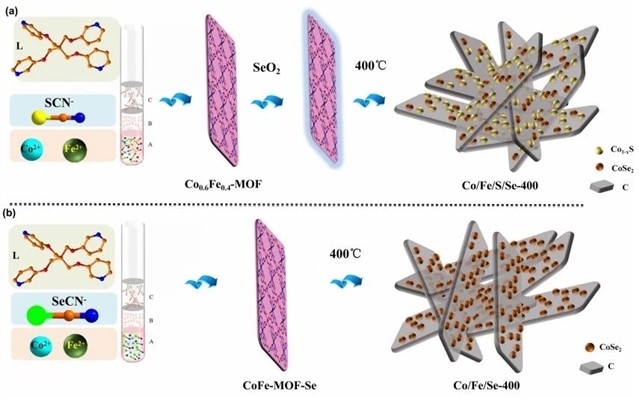 图1(a) Co0.6Fe0.4-MOF(蚀刻法中的原始2D-MOF)和Co/Fe/S/Se-400(腐蚀法中的焙烧衍生物)以及 (b) CoFe-MOF-Se(替换法中的原始2D-MOF)和Co/Fe/Se-400(替换法中的焙烧衍生物)的制备示意图。