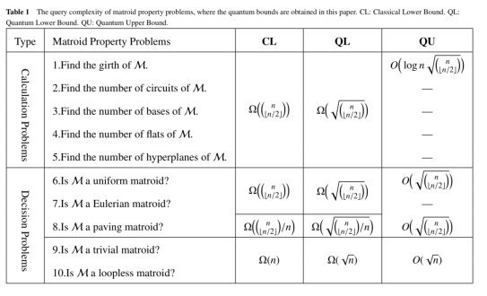 针对一些基础拟阵问题(包括计算拟阵的围长、圈数目、基数目、平面数目和超平面数目,以及判定是否是均匀拟阵、欧拉拟阵和铺拟阵)的量子查询复杂度和量子算法,中山大学李绿周教授团队撰写了研究论文:关于拟阵问题的量子加速及局限性。