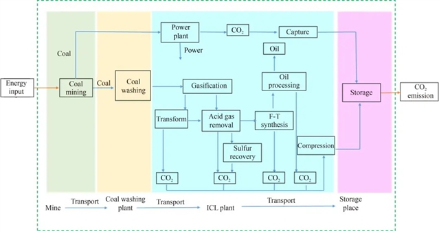 然而目前对煤制油耦合二氧化碳捕集、利用和存储技术的生命周期碳足迹的研究中,大多数研究只考虑了石油生产过程,而没有将范围扩大到采矿、洗涤和煤炭运输等活动。部分研究关注的是全链碳排放和全生命周期的平准化成本,而没有考虑耦合碳捕集技术后碳足迹和平准化成本的变化。仅少数研究将二氧化碳捕集、利用和存储技术纳入生命周期分析,但没有充分评估DCL和ICL的碳足迹和成本。同时,对煤制油耦合二氧化碳捕集、利用和存储技术的生命周期碳足迹研究和评估过于宏观,在计算碳足迹和成本时并未考虑具体的捕获单位和运输距离。